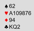 Syd har vist en voldsom fordelingshånd med spar- og ruterfarge. En kan anta noe sånt som 6-6 eller 7-5 i de to fargene. Kontrakten er 6 spar. Hva spiller du ut?