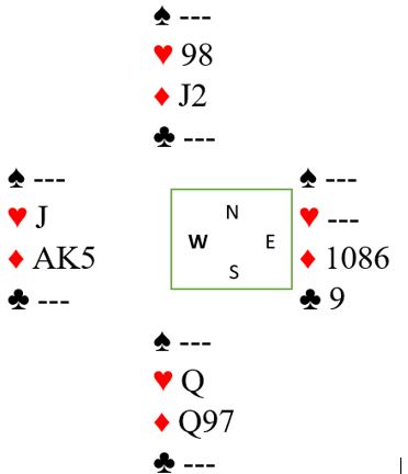 På kløver 9 kan syd bare pakke sammen. Kastes hjerter dame forsvinner ruter 6 fra vest og østs A-K i ruter og hjerter knekt tar de tre siste stikkene. Og om syd kaster en ruter for å holde på hjerter dame forsvinner hjerter knekt fra vest og det blir tre ruterstikk til slutt.