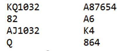 Alt er trist i dette spillet bortsett fra resultatet, +420. Utspillet ved begge bord er dårlig (men alle utspill kan jo være klaff), motspillene veldig svake, og skift til liten hjerter mot slutten er toppen på kransekaka. Øst bør se at han kan bli skviset, og hvis han spiller hjerter bør å spille damen være opplagt. Da holder vest hjerteren, og N/S går fortjent bet i den for hardt meldte utgangen.