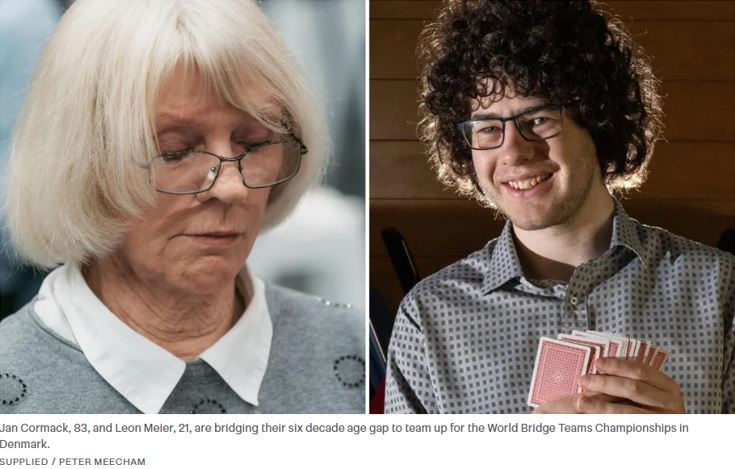 Som nevnt har Norge mange svært gode juniorspillere, både jenter og gutter med Nicolai Heiberg-Evenstad i spissen. Som 17-åring har han allerede debutert på det norske landslaget i åpen klasse. I New Zealand hvor jeg bor er det også en gruppe unge spillere som viser bra takter. En av dem, Leon Meier som jeg har spilt en god del med debuterte på landslaget i åpen klasse som 19-åring. I VM i Herning skal han spille i mix-klassen i et makkerskap som har en uvanlig stor aldersforskjell, kanskje en av de største i et verdensmesterskap? Leon har nå blitt 21 år, og makkeren Jan Cormack er 83 - mer enn seks tiår mellom det to i makkerparet! Snakk om "bridging the age gap"!