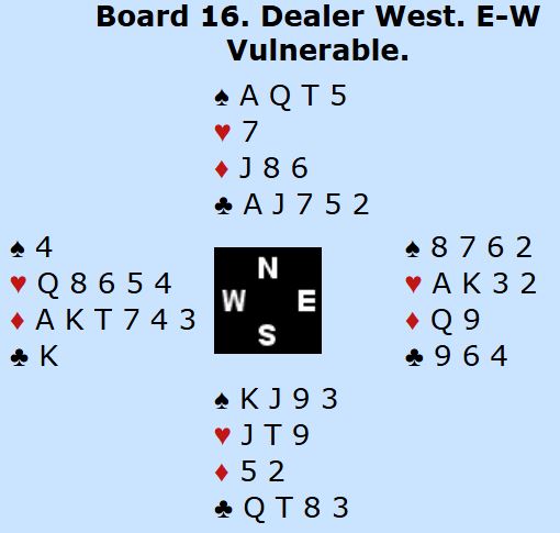 Norge Open fikk til en stor seier (nesten maks antall VP) mot svakt plasserte Guadeloupe. Her er et spill av typen storsving, og det handlet om å treffe i meldingene idet begge sider melder på høyt trinn.