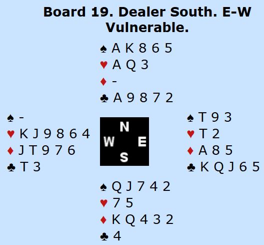 N/S sine kort er vel ganske greie å melde om man får melde i fred. Men etter vests 2 ruter i åpning er det ikke så enkelt. Italienerne var altså i 6 spar som greit ble vunnet. Ved det andre bordet fant ikke Norge frem til slem etter at nord hoppet til 4 kløver over vests 2 ruteråpning. 4 kløver var såkalt Leaping Michaels (kløver + spar, minst 5-5). Der stoppet meldingene, nord visste ingenting om syds kort som kunne vært helt uten verdier. Italia vant 11 IMP på spillet som et bra bidrag til å vinne kampen med hele 40-3.