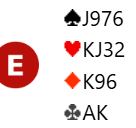 Ved det andre bordet åpnet syd med 1 kløver. Kvangraven og Grude var også med med Ø/V sine kort, men da N/S var i 3 kløver ga de seg. I den kontrakten ble det også elleve stikk, Norge -150. Spillet ga 11 IMP i kampen som altså ble vunnet med ett fattig IMP.