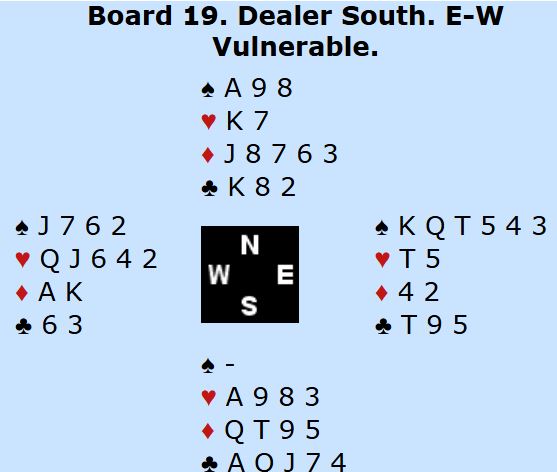 En bør i kløverkontrakt spille kløver ess og kløver til kongen. Hvis den sitter 3-2 kan en spar stjeles, så over til øst og ut med trumfen. Det gir 1+3+3+6 stikk (ett ekstra trumfstikk for stjeling på den korte trumfhånden), totalt tretten. Om kløver sitter 4-1 med singel tier eller knekt hos syd tas kløverfinesse over nord. Da må det etterpå ordne seg med ett ekstra stikk i hjerter som er en god sjanse.