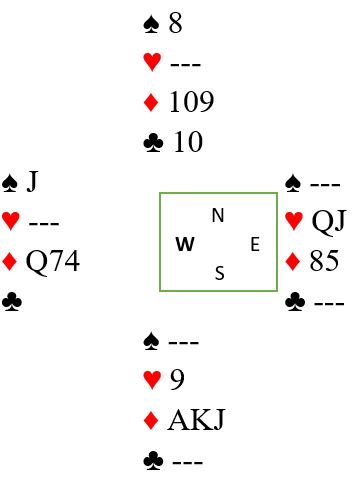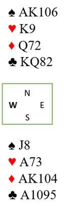 Det spilles liten kløver mot bordet. Om vest legger liten vinnes med kongen, så spilles garantert liten tilbake til syds ess. For det er nå kun en 4-1 sits spillefører kan løse. Om øst har J-9 fjerde har han sikkert stikk uansett. Idet liten spilles fra nord i andre trumfrunde følger ikke øst farge. En markert finesse med tieren tas i fargens tredje runde. Fargen så altså slik ut fra start: