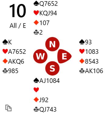 Hvis kløveren sitter 3-2 er det svært gode sjanser i denne storeslemmen. En spar kan trumfes hos syd etter uttrumfing. Da kan spar dame komme på og tieren gi stikk. Sparstjelingen gir ett ekstra trumfstikk og 2+2+3+5=12 sikre selv om spar 10 ikke blir stikk. Så det trettende stikket kan som nevnt skje pga. at spar dame sitter dobbel eller tredje, at ruteren ordner seg, eller muligens en spar-ruter skvis.