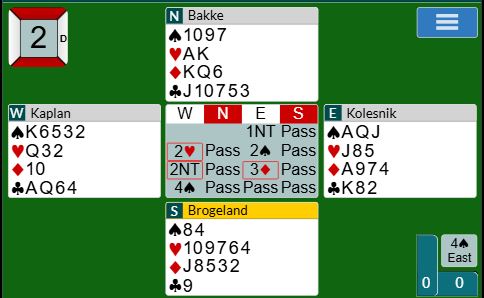 Kolesnik må ha tenkt noe sånt som at om syd følger med kløver i andre stikk stikkes hos vest, så trumf til øst for å ta to runder av den fargen fulgt av nok en kløver mot vest. Om syd da kan trumfe er det med motpartens siste trumf, og vest kan i det stikket følge med liten kløver. Går det slik vil vests fjerde kløver - en honnør - gi avkast for en hjerter, og det blir ti stikk fordi øst fortsatt har igjen en trumf og ingen motstander har igjen trumf. Det spillefører muligens glemte var at kløveren kunne sitte 5-1 (?). For spilleføringen fungerte absolutt ikke. Brogeland trumfet i andre stikk. Så hjerter over til nord som tok også for den andre hjerterhonnøren sin før han spilte kløver slik at syd fikk sitt andre trumfstikk. Til slutt fikk Bakke også ett trumfstikk med hjerter fra syd til stjeling. Nitrist utvikling for USA og to bet, Europa +100!