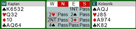 Kolesnik tenkte nok omtrent i de banene, men var vel litt for rask på labben da han stakk med kløver konge og spilte spilte kløver mot bordet i andre stikk. Da ramlet taket i hodet på amerikaneren, for slik så hele spillet ut:
