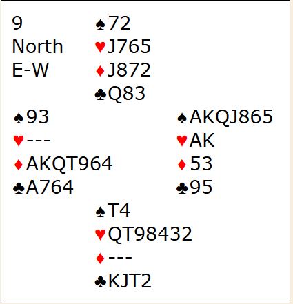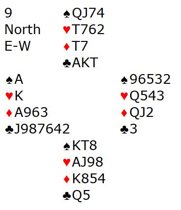 Som du ser ville hjerteren blitt løst med kun to tapere slik det sitter. Så denne utgangen ville mest sannsynlig blitt vunnet av de fleste klubbspillere. Som du også ser funker også den planen vi nevnte med å ta kun to runder trumf og spille kløver mens en motstander har igjen en trumf. Nord som blir sittende med den siste trumfen må følge farge idet kløverhonnørene spilles så vests fjerde kløver kan trumfes hos øst og det er ti sikre. Da blir det fort elleve stikk også siden hjerteren sitter fordelaktig.
