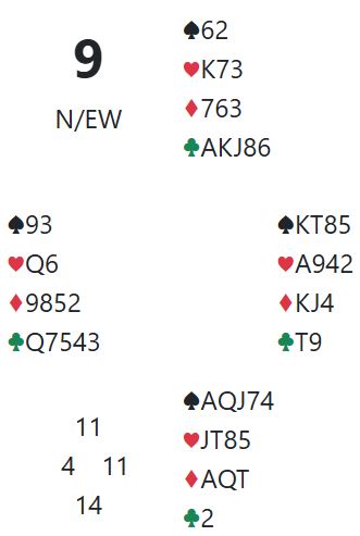 Den doblede kontrakten var helt håpløs for spillefører. Det kan nesten se ut som det vil bli kun et par stikk, for hjerter ess og ett trumfstikk for den trettende ruteren. Men med verdiene i majorfargene måtte det etter hvert bli ett stikk til. Likevel fire doblede bet i kontrakt på ett-trinnet i faresonen, N/S +1100!