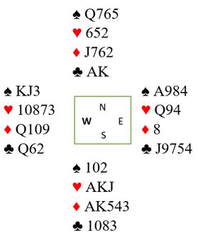 Du vet at syd startet med A-K femte i ruter. Og hva med hjerteren? Om makker har hjerter K-Q ville han neppe kastet hjerter 9. Alt tyder på at makker startet med Q-9-x i hjerter, følgelig har syd A-K-J i den fargen.