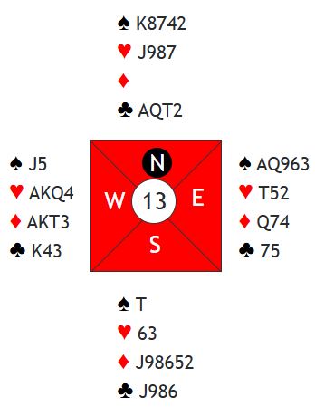Versjon 2: Nord spiller ut hjerter. Da kan første stikk vinnes med hjerter 10 - det ellevte stikket. Så blir det en litt mer avansert variant, en skvis i spar og kløver som avsluttes med et innspill på det som mot slutten må være singel kløver ess fordi han må holde fire spar. Den varianten kan du pusle litt med selv, mens vi skal se på det som skjer hvis nord spiller ut spar som ikke gir spillefører noe ekstra.