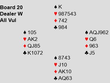 Selv om noen fikk kun ni eller ti stikk var det også noen som fikk 12 stikk i 4 hjerter, men ikke så mange. Og det var noen veldig få som meldte og vant slem. Likevel burde vel normalt +450 komme like bak +480 og dem som meldte og vant slem, og dermed gi noe over middels? Det gjorde altså ikke den scoren. Bak +980 kom det først noen som fikk tak i +800. Det var dem som klarte å straffedoble 2 spar som ikke ble noen fest for N/S, tre doblede bet i sonen, mens noen Ø/V-par fikk tak i +500. Det var også noen få doblede hjerterutganger med hjemgang, men den overaskende scoren som skjedde ved hele 52 (!) bord var +490 for 3NT med 12 stikk! Ved 16 bord ble det +460 for 11 stikk i 3NT. Altså var over 1/4 av Ø/V parene i 3NT!