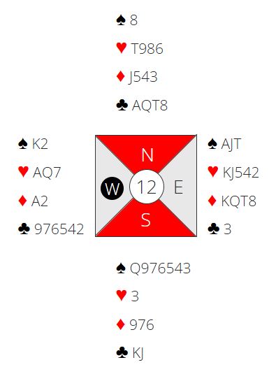 //Det blir neppe mange som får tolv stikk i 4 hjerter. De få parene som eventuelt får det deler nok toppen Ø/V. Det er en grei score å notere +450, for noen får antagelig bare 10 stikk.//