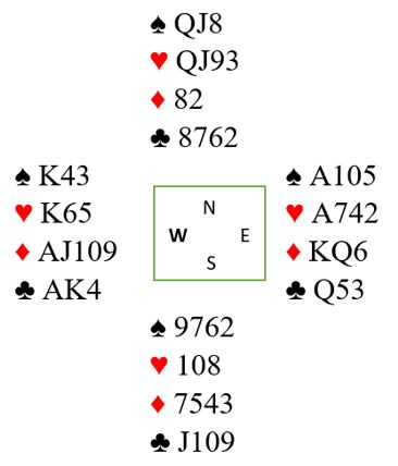 Det er ikke bare 3-3 i hjerter som er sjansen her. Det kan oppstå en skvis, og i så fall må det bli en skvis i hjerter og spar. Mange føler at skvis, innspill og slikt er veldig vanskelig. Det kan være det, men i noen tilfeller hvor en har resten av stikkene minus ett stikk kommer skvisen omtrent av seg selv hvis forutsetningene for en skvis er tilstede. Det viktigste er ofte å passe på å ha overganger til begge sidene.