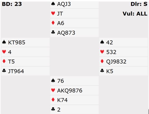 I turneringen hvor 56 par deltok meldte kun ett av 28 N/S-par 7 hjerter. Kontrakten ble vunnet, men skal man være ærlig litt ufortjent da spillefører etter kløver knekt i utspill ikke prøvde på kløveren i det hele tatt! En ruter ble trumfet hos nord, og senere ble sparfinessen tatt! Svakt spilt, men 100% score. Det er grunn til å synes litt synd på Ø/V som satt i mot og måtte finne seg i å få 0%.