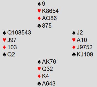 Da den finessen lyktes spilte han tre store spar fulgt av den fjerde sparen som ble stjålet med syds andre trumf. Øst kunne bare se på og kaste unna tapere, mens vest som hadde igjen trumfdamen dobbell måtte følge farge i alle sparrundene. Etter sparstjelingen fulgte kløver til stjeling hos nord og uttrumfing. Dermed ble det tretten stikk og + 2140 som ga alle poengene – samt en IBPA pris!