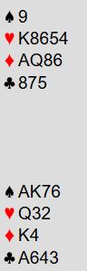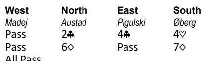 Marius sin makker Ida Marie Øberg sitt ressonement for å løfte til storeslem var ganske forståelig: «Når makker kan melde lilleslem med sin hånd, og jeg sitter og ser ned på to ess må det sannsynligvis stå i storeslem». Så hun sa 7 ruter, og da var det opp til Marius «to bring home the bacon»...