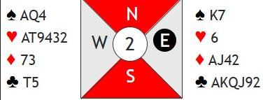 Å havne i 6 kløver er bra. Om det kommer spar, hjerter eller kløver ut kan normalt ett ruterstikk gis bort, og en ruter kan trumfes hos vest. Den siste ruteren kan kastes på vest tredje spar. Det betyr at 6 kløver greit vinnes om det ikke sitter fælt (for eksempel 6-2 i spar). Og det satt 6-2 i spar: