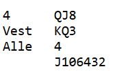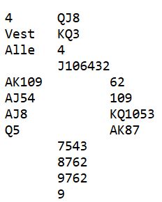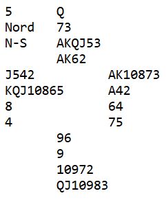 I denne turneringene deltar spillere uten så mye erfaring. Noen kort passer derfor ikke helt til det de har lært med hensyn til antall honnørpoeng (HP) for å melde utgang osv. Det er hvis det er veldig skjev fordeling, lange farger og enorm tilpasning, kanskje i begge retninger. Slikt kommer med mer erfaring, men vær klar over at selv for veldig erfarne spillere kan det være vanskelig å tråkke rett når det er den typen kort. Her er et eksempel på et sånt spill fra denne turneringen: