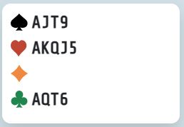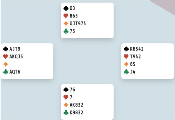 Vest hadde fått utlevert monsterkort. Med DE BOTTON sitt par Ø/V åpnet syd med 1 ruter. Vest doblet, og fra nord kom et spenstig hopp, 5 ruter! Det gikk pass-pass tilbake til vest. Hva ville du meldt nå?
