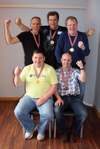Våre gutter taklet presset i dagens kamp og vant NM for lag 8 VP foran Vikersund! Namsos har spilt 7 kamper i helgen, og har vunnet 6 av de. Nesten 19 VP i snitt er sterkt! 5 glade gullvinnere! Før den siste kampen ledet Namsos 6VP foran Vikersund. Namsos hadde slått Vikersund innbyrdes, så seier 19-11 i siste kamp mot Harstad ville sikre seieren uansett resultatet i de andre kampene. Siste kampen endte 21-9, og gutta kunne slippe jubelen løs! Ragnar melder om god stemning i bilen på tur hjem. Resultater finner du her Butleren (individuell score) her Namdalsavisa har også fått med seg de store nyhetene. Ler mer på deres nettsider Namsos skal nå representere Norge i bridgens Champions League til høsten. Vi gratulerer Geir Enge, Jørn Arild Ringseth og Ragnar Davidsen med deres første norgesmestertitler, og Per Arne Flått og Frode Nybo med sine første titler siden parseieren i 1990!
