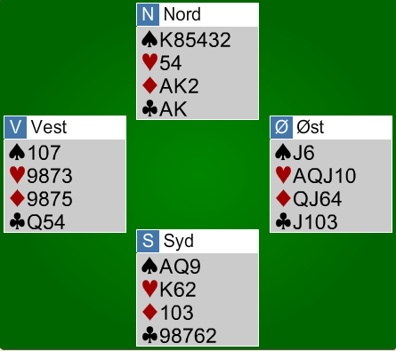 Spar 10 ut til kongen, og i tur og orden prøvde jeg minorfargene. Ingen av dem oppførte seg etter ønske, og vest kastet to hjertere. Nå satset jeg beinhardt på at hjerterlengden hadde esset og spilte spar ess og mer spar. Vest kunne hente et sparstikk til, men måtte så gi meg det niende stikket for hjerter konge.